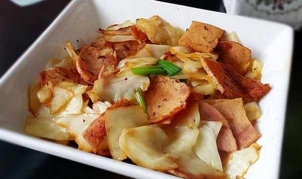 做法:1、白菜洗净,用手撕成小块;培根用刀切成小块;
