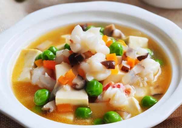 材料:软豆腐、大虾、豌豆、胡萝卜、洋葱、香菇、姜末、盐、骨汤