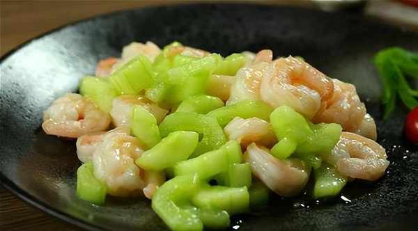 4、锅内余油烧热,加入切碎的姜丝和黄瓜条炒熟,加少许开水,加入虾仁和盐,搅匀后用湿淀粉勾芡。