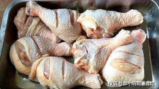 材料处理:把鸡腿洗干净,用刀斜切几刀,用小叉子在鸡腿上均匀的扎出小洞,可以让腌制的时间缩短也更入味