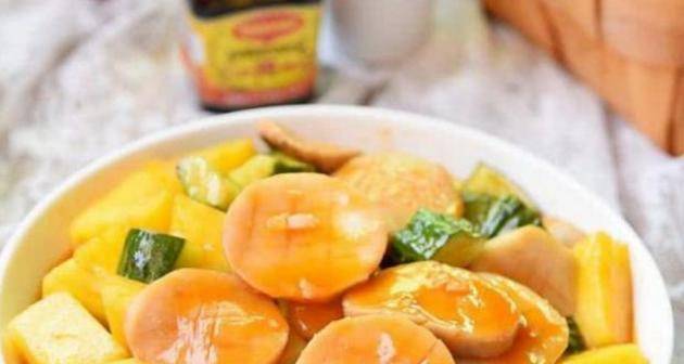 配料表:杏鲍菇、黄瓜、菠萝、姜、蒜、生抽、白醋、糖、盐、番茄酱、小葱
