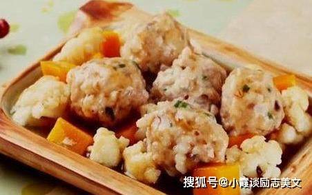 5.将菜花块和南瓜块放在盘子里,把煮好的丸子放在上面;