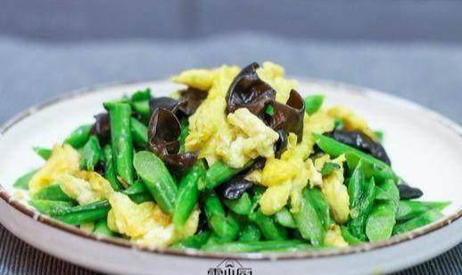 5、倒入芦笋,加盐,大火翻炒半分钟;倒入鸡蛋搅拌均匀,再煎几下即可出锅。