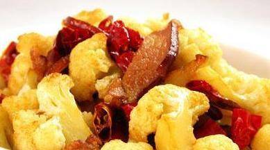 准备:1、花菜洗净切小块,香菇洗净切条;锅内水烧开,放入香菇焯水,沥干水分待用;然后将花椰菜煮2分钟,取出冷却备用;切段,生姜切片;干辣椒切成片;