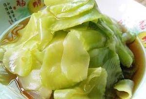 3、将腌好的生菜挤干;倒入混合糖醋,淋几滴香油腌十分钟。