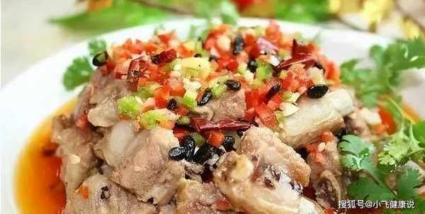 3.蒸锅内的水烧开后,将排骨和容器放入抽屉。大火蒸20分钟后,撒上干红辣椒继续蒸10分钟,关火。在平底锅上撒上切碎的葱。肉质鲜嫩,酱油诱人。