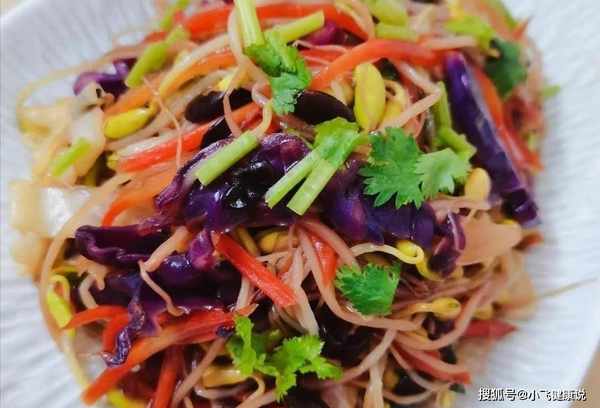配料及调料的准备:豆芽、紫甘蓝、卷心菜、萝卜、香菜、姜、植物油、陈醋、白糖、素蚝油、松茸鲜菜粉、生粉。