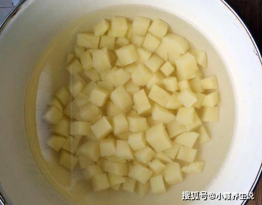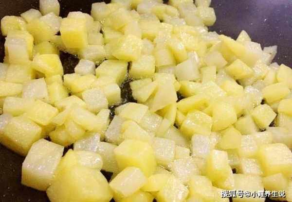 第五步,锅内放适量油,放入土豆丁,将土豆炒至变软外皮微黄,捞出沥油备用。