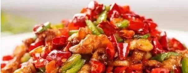 6、锅中取油约50克,中火加热至50%,放入葱、姜、蒜、干辣椒、花椒爆出香味。倒入炸好的鸡块,炒至鸡块均匀分布在辣椒中。出锅前撒上鸡粉3克、盐1克、白糖10克、芝麻20克搅拌均匀。