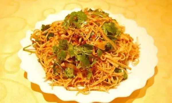 将磨碎的胡萝卜放入一锅沸水中焯一下,取出并冲洗至冷却并挤出水分。将所有材料混合,加入香油、盐,撒上鸡食,撒上香醋拌匀。