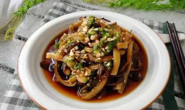 海蜇皮清洗干净后,切块,用水浸泡2小时,中间换3次水。
