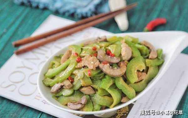 材料:苦瓜1条、猪里脊1条、花椒2克、酱油5克、蚝油5克、料酒8克、盐2克、水半碗