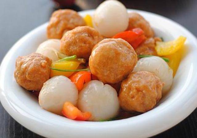 6、放入荔枝肉和肉碎,加入花椒粉、鸡精、盐、蚝油、水调成汁;