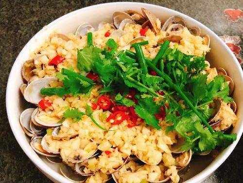 1.锅中油烧热,加入切碎的大蒜爆香;