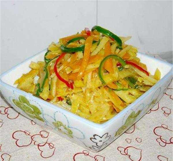 材料:南瓜200克,土豆200克,青、红辣椒各1个,油、盐、糖。