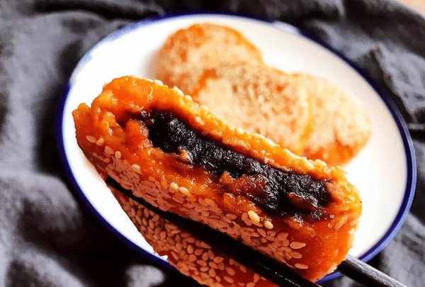 接着裹上芝麻,再轻轻按扁。最后给锅内加油,放入小饼小火煎熟,就可以食用了。