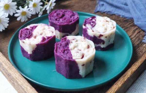 紫薯、山药分别去掉外皮,处理干净后冲洗一下,再切成小块,放进蒸锅内,大火蒸十几分钟,至熟透。