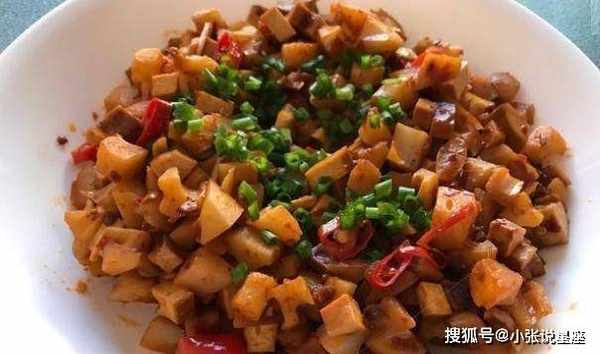 1.豆腐干切丁。莲藕去皮洗净切丁;