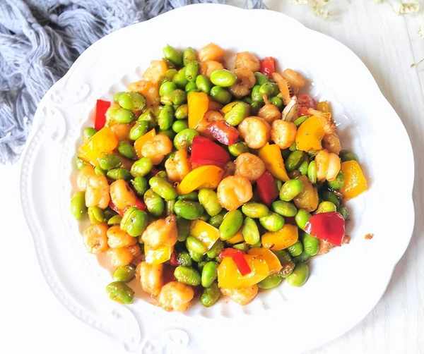 另起锅加油,烧热后放入虾仁翻炒,炒到变色。再倒入彩椒、毛豆翻炒,炒一分钟。