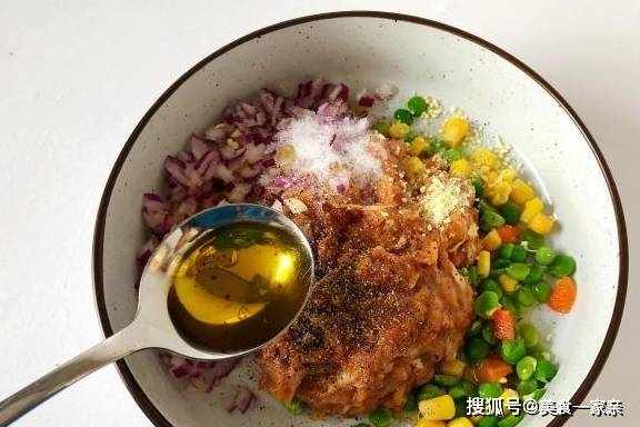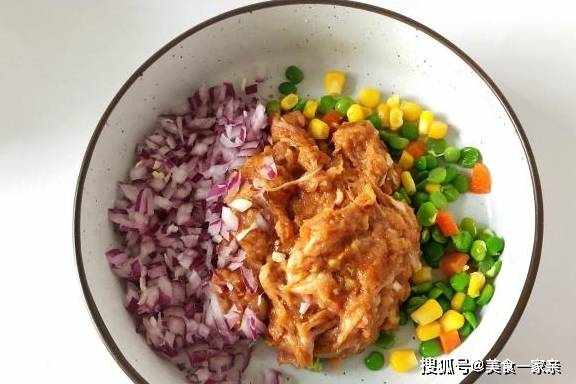 步骤3:搅好的肉馅直接放入大碗中,切一些洋葱末,再加入一些什锦豌豆粒(豌豆粒,玉米粒,胡萝卜粒,都是焯过水的,速冻的,超市里就有卖,几块钱一斤,我们在用之前从冰箱取出,可以用开水烫一下,把豌豆粒的皮去掉)