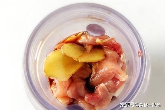步骤2:鸡腿肉直接放在搅拌杯中,+2片生姜,加入两勺生抽和一勺料酒,启动搅肉馅功能,搅成鸡肉馅,家里如果没有搅拌杯,也可以用刀剁成肉馅。