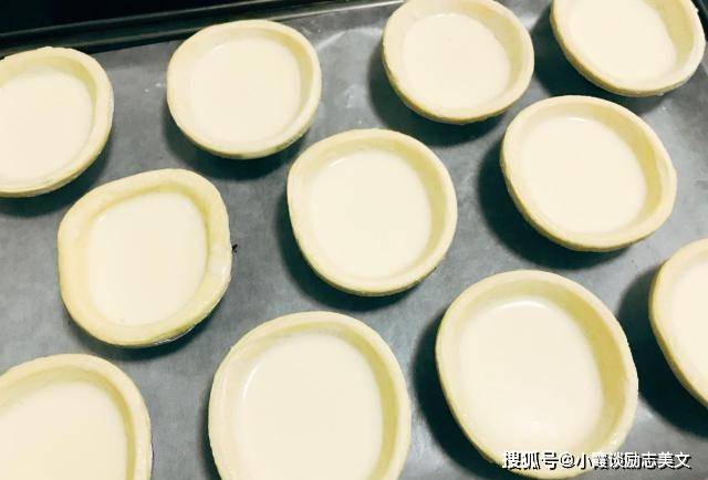 第二步:将蛋挞壳预溶化,放在垫了油纸的烤盘上,倒入蛋挞液,90%满。烤箱应预热至210度。