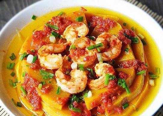 配料:南瓜500克,虾仁100克,油50克,蒜蓉辣椒酱3勺,盐1/2勺,料酒1勺,葱2根