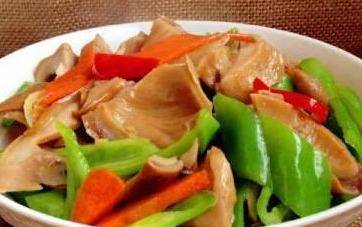 2、锅内油烧热,放入葱花炒香,放入肚片翻炒几下,加入青椒、红椒、盐、料酒、味精,炒至半熟,水淀粉勾芡,淋上香油即可食用。