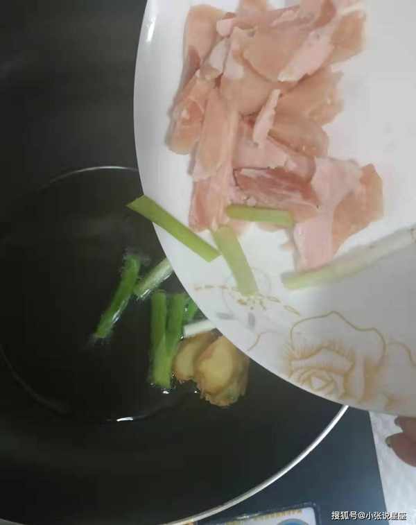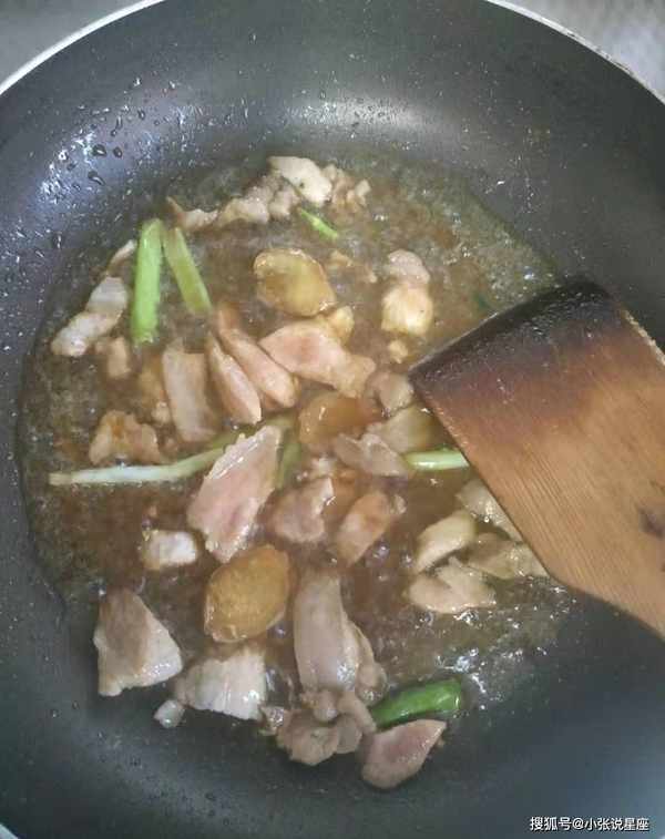 5、热锅油烧热,放入小葱、姜片炒香,加入肉片翻炒均匀;