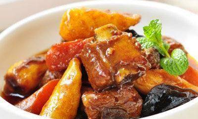 4、锅内留底油,加入适量豆瓣酱和少许白糖,炒红油后,将排骨倒入锅中,倒入适量料酒、生抽拌匀。炒熟,然后加入葱和胡萝卜倒入适量的水,蘑菇放入水中,盖上锅盖煮十分钟。待胡萝卜软烂时,加入半茶匙盐,倒入山药,煮至汤汁浓稠,出锅能尝出三排鲜排骨的味道。
