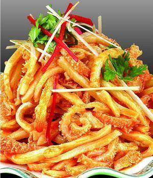 3、焯好的肚片捞出,用清水冲洗干净,浸入冰水中冷藏。