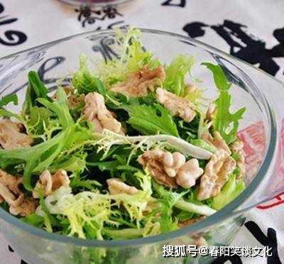 材料:苦菊花、核桃(干)、盐、糖、醋、橄榄油、生抽