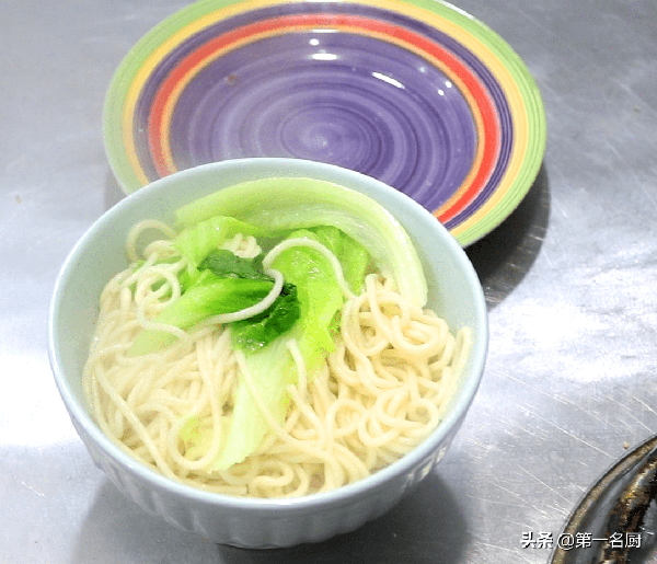 3.起锅烧水,加入一勺食盐,水开后下入面条煮5分钟左右,煮至面条颜色发白时,下入生菜叶,10秒钟后和面条一起捞出放入碗中。