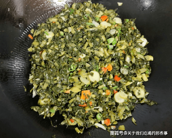 3、起锅烧油,下入姜蒜末、干辣椒爆香,倒入胡萝卜缨酸菜快速翻炒,炒出香味后加入适量食盐,再放入青红辣椒丁翻炒一会儿,加入适量鸡精炒匀后即可出锅。