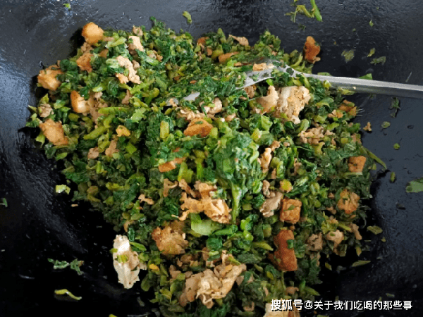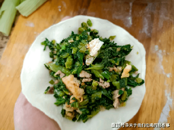 2、胡萝卜缨洗干净,烧一锅开水,放入胡萝卜缨煮1分钟,捞出过凉水,沥干水分后用刀剁碎,放入肉馅中,加入适量食盐、香油,搅拌均匀后腌制30分钟。