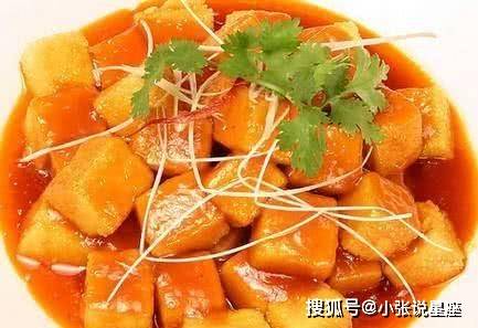6、将炸好的豆腐块放入锅中煎熟,加入番茄酱。