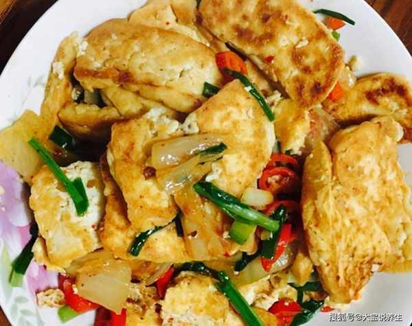 材料:豆腐250克、洋葱50克、韭菜3条、红辣椒2条、生抽15毫升、料酒15毫升、白糖5克、盐少许
