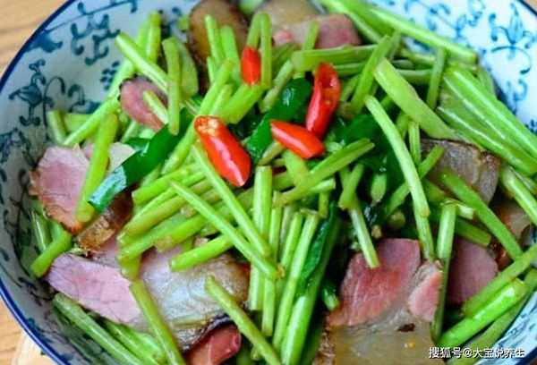 原料:藜蒿350克,五花肉或腊肉200克,姜少许,蒜少许,干辣椒少许,盐少许,鸡精等。