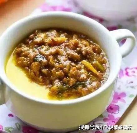 4、炒锅热油,放入生姜片爆香后捞出生姜不要,再放入葱花,肉沫煸炒,加几滴料酒,肉沫煸炒至颜色发白,加少许老抽和生抽、水煸炒,撒葱花,加少许盐和糖调味后翻炒出锅;将炒好的肉末倒在蒸好的鸡蛋上即可。