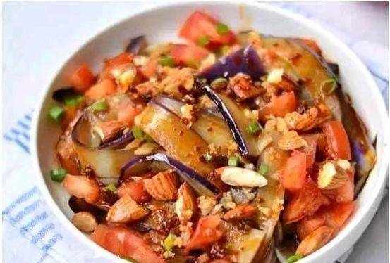 5.倒入茄子碗中拌匀,撒上杏仁碎。