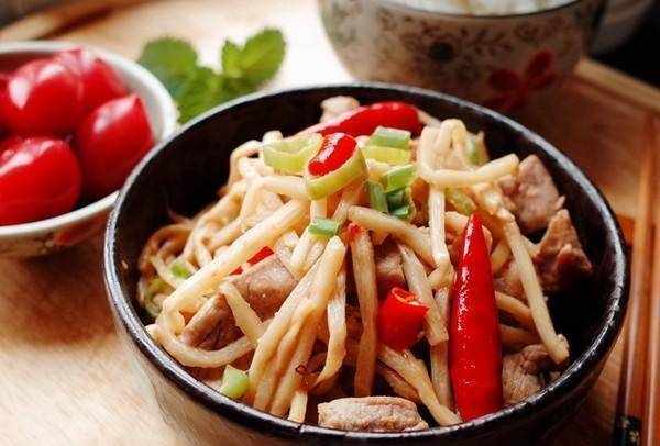 材料:酸笋150克,猪肉120克,灯笼椒1个,红辣椒1个,色拉油1汤匙,鸡汤1/8茶匙,生姜1/4茶匙,大蒜10克,大蒜10克料酒1汤匙、生抽1汤匙、生粉1茶匙、水2汤匙