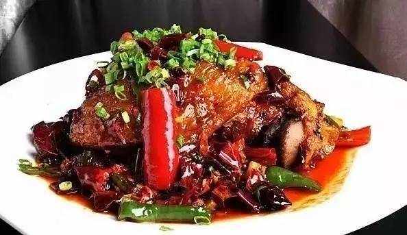 4、炸肘子稍煮后,转大火至锅内汤汁收干,锅内倒入花椒油和香油,撒上青、红灯笼椒段拌匀。当你把锅放在盘子里的时候,撒上一片葱花。