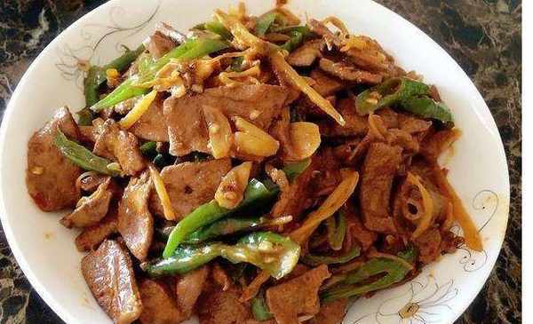 猪肝熟的比较快,用棍子掰开,中间不是红就是熟了。最后放盐,搅拌均匀。如果事先加盐,猪肉会出水,搅拌到最后不会变软。