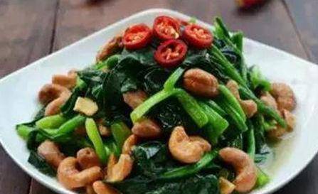 原料:菠菜、水煮腰果、盐、白糖、酱油、香油、味精、红辣椒?