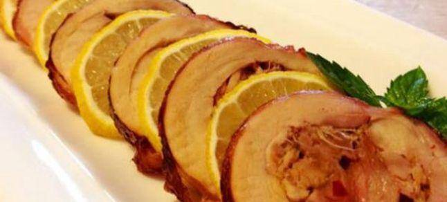 4、将腌好的鸡腿皮在外面,慢慢卷起来,用锡纸包好,放入烤箱200度烤30分钟。