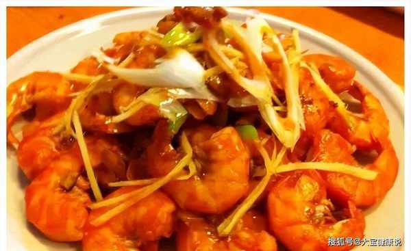 5.将虾体全部倒入煎锅中,每只虾尽量平放在锅中,稍微盖上锅盖,看到变色后转小火,先捞出虾头。放在盘子中间,收一堆,然后捞出虾身,摆成一圈。把洋葱和姜放在上面