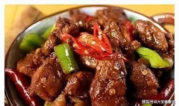 3、当鸭皮两面金黄时,大量的鸭油就出来了,鸭皮就塞进去了。将干辣椒倒入鸭油中,然后将辣椒炒香。