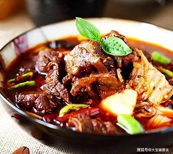 4、将切碎的牛胸肉放入锅中,继续煮一个小时左右。辣白菜,再煮十分钟。可相应添加胡椒粉、香菜、洋葱等。