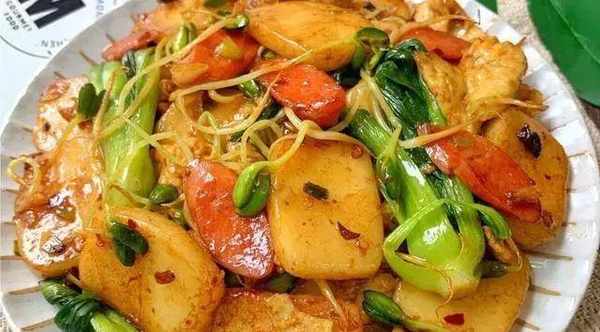 下油锅爆香小葱蒜末,加入火腿肠翻炒,不断翻炒至微黄,加入青菜和豆芽炒软