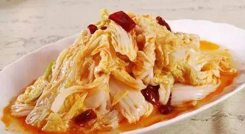 3、锅内倒入植物油烧热,将姜末炒香,加入泡好的白菜片和胡萝卜圈,加入醋、糖、盐、味精,边翻边炒匀,淋上香油,出锅用水淀粉勾芡。